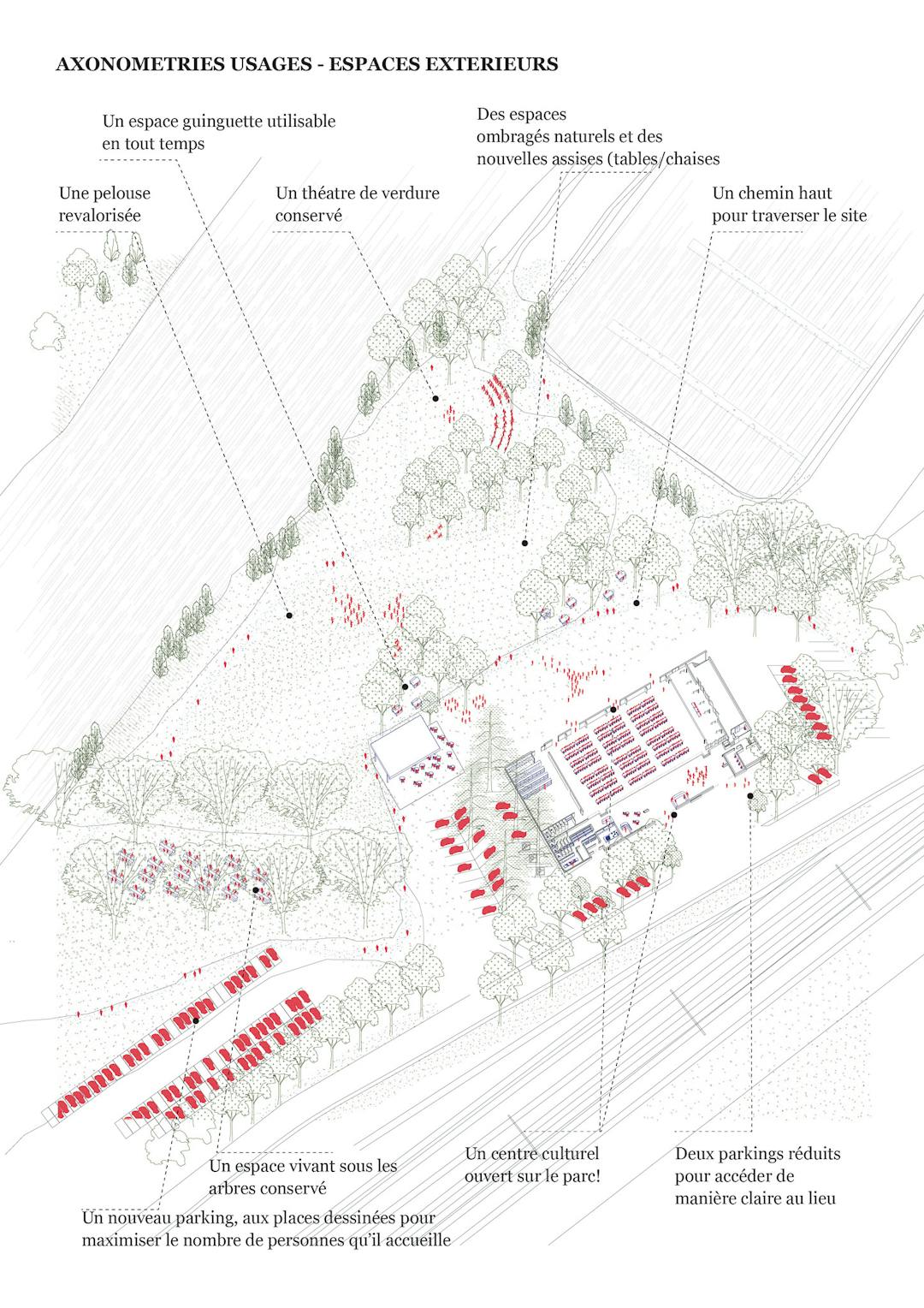 La réflexion porte également sur l’espace qui borde le centre culturel et sa transformation en un espace naturel cohérent et utilisable par les habitants de Guipry au quotidien comme pour la programmation d’évènements majeurs.