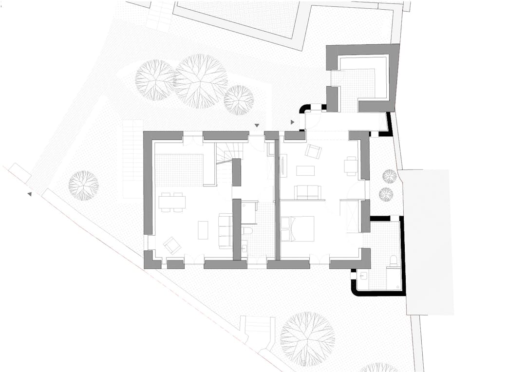 L’orientation Est-Ouest du bâtiment se prête idéalement à la création de logements traversants, favorisant une ventilation naturelle efficace. Deux extensions légères en structure bois viennent s’insérer dans les espaces résiduels extérieurs, tout en assurant une continuité entre les deux volumes bâtis existants.