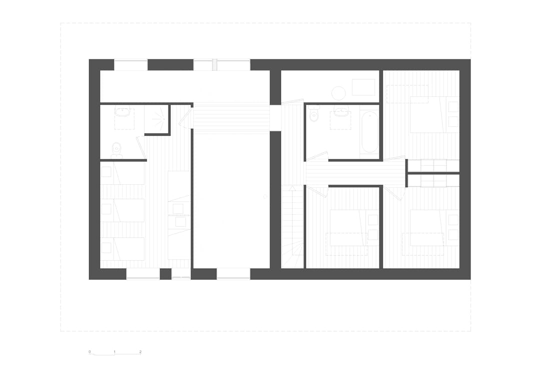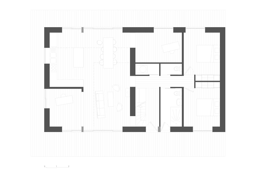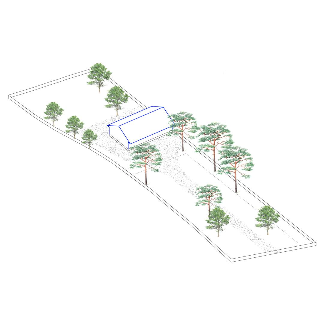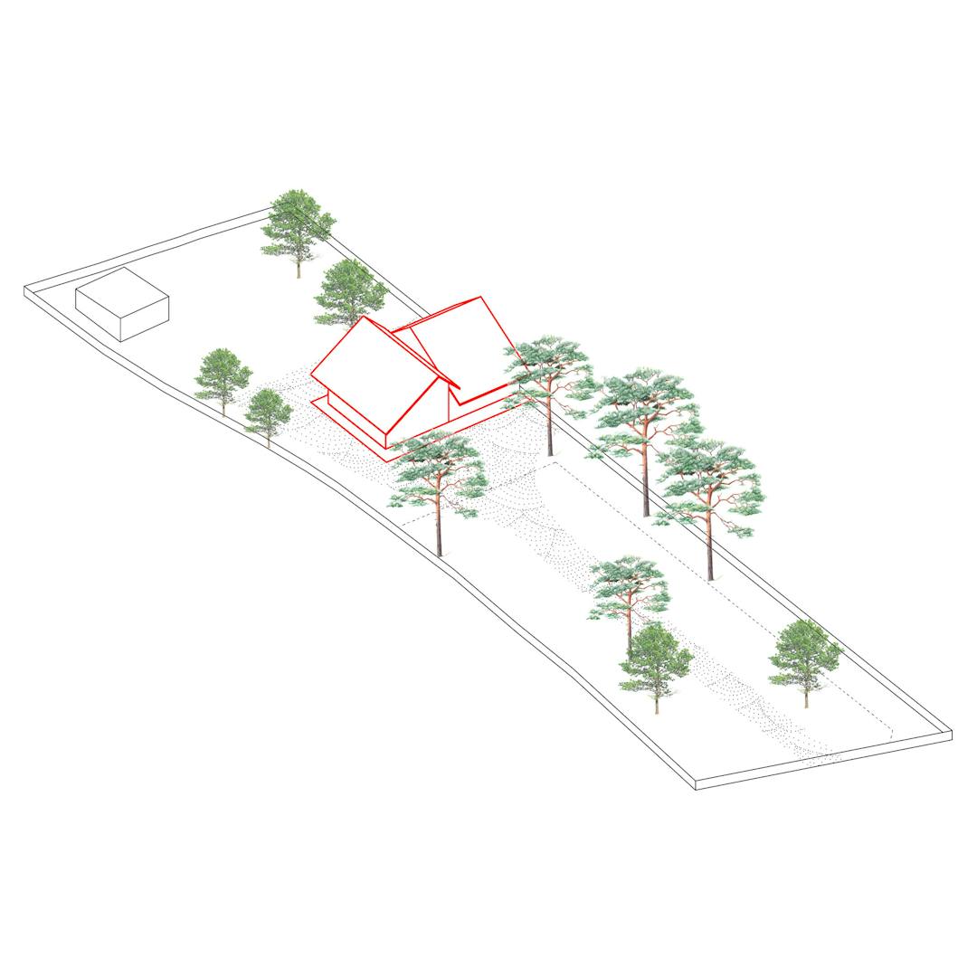La nouvelle proposition reprend un ensemble d’éléments propres à la maison ancienne, tant pour des raisons réglementaires (interdiction de changer la surface au sol de la construction en zone PPRI) que pour des raisons sentimentales, patrimoniales et écologiques. Le plan du bâtiment est basé sur la commande spécifique des clients qui avaient le besoin d’un nombre conséquent de petites chambre et d’un espace de vie rassemblant bureaux, salon et cuisine, traversant et ouvert sur l’extérieur. Pour répondre à cette contrainte, le projet utilise le vocabulaire des temples japonais, allant des circulations jusque’à la forme de la toiture tout en refusant de vouloir y ressembler pour des raisons de cohérence visuelles avec son environnement.