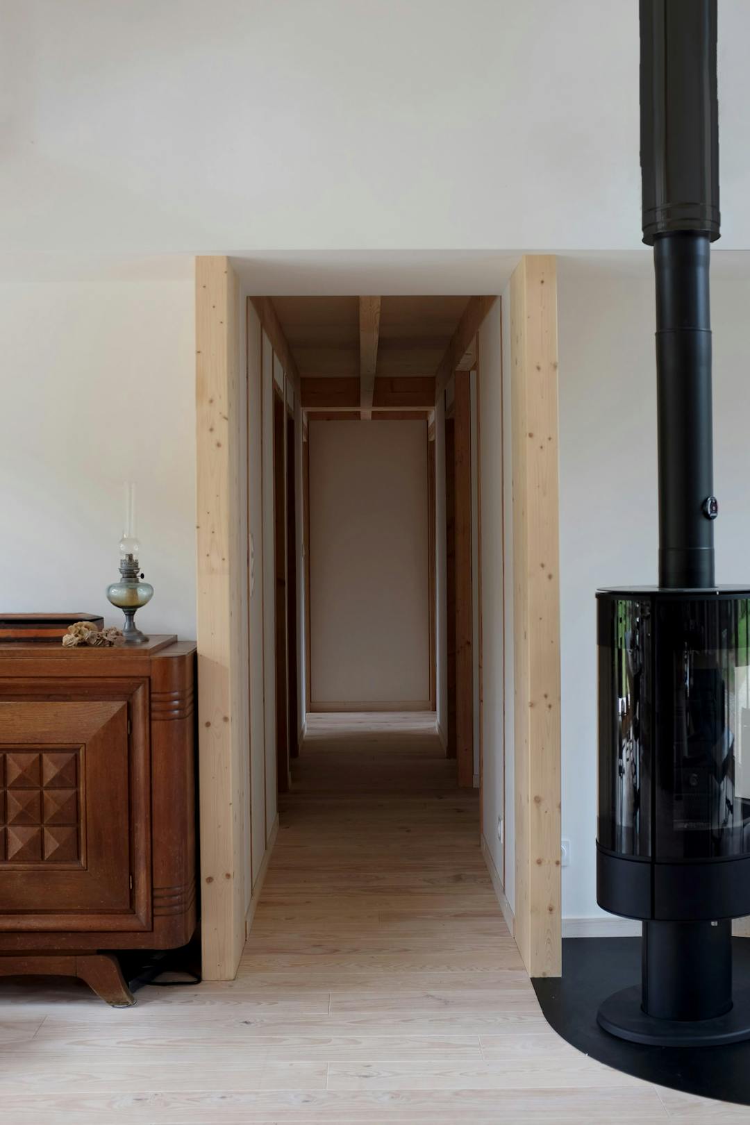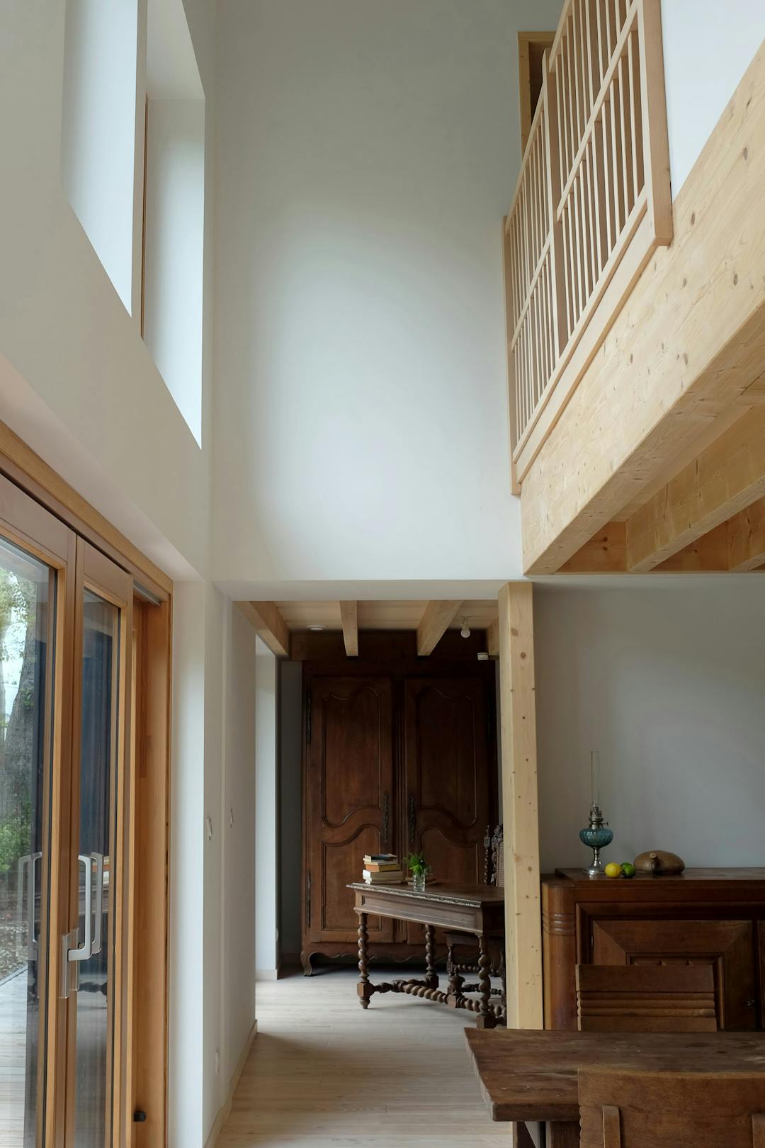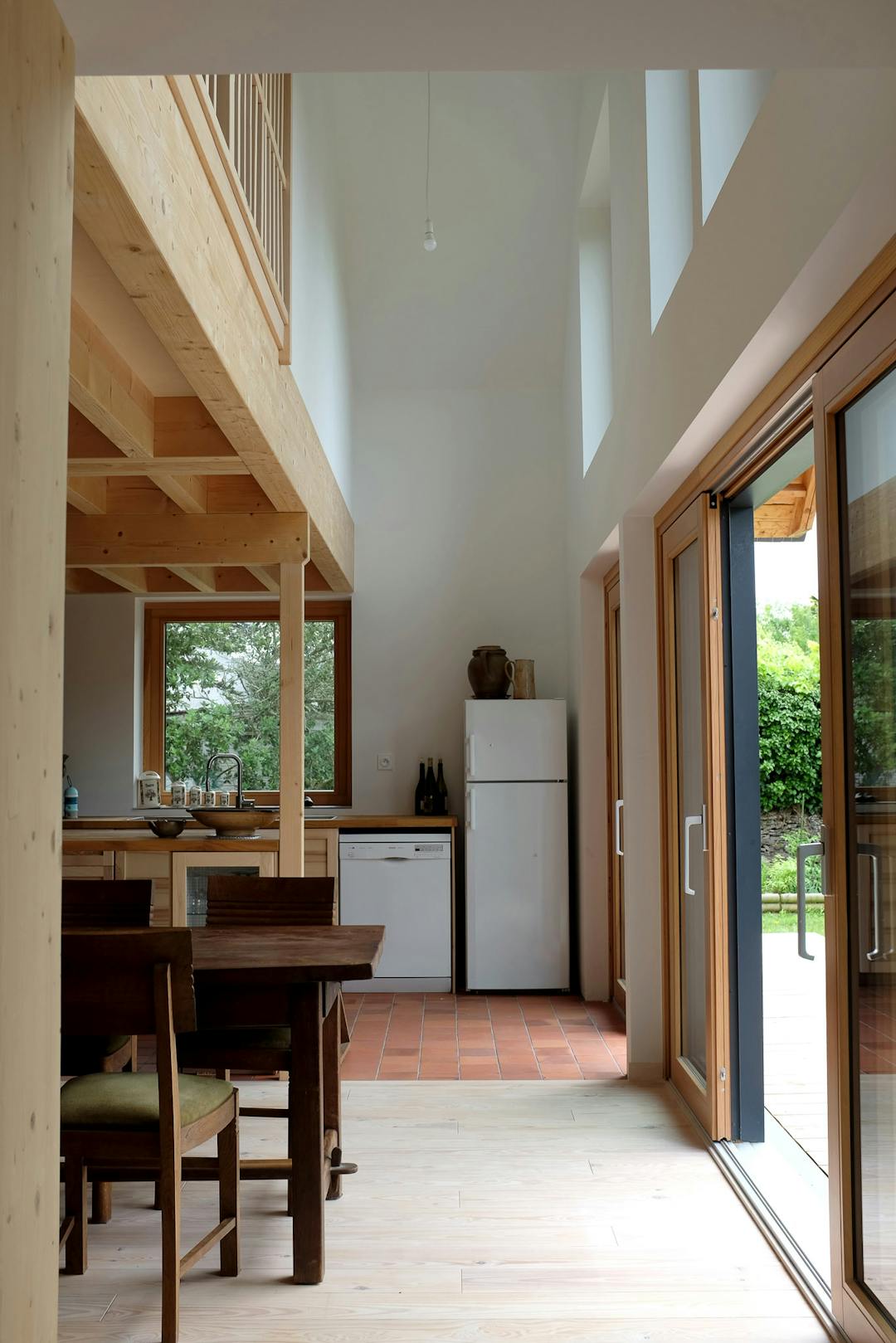 La nouvelle proposition reprend un ensemble d’éléments propres à la maison ancienne, tant pour des raisons réglementaires (interdiction de changer la surface au sol de la construction en zone PPRI) que pour des raisons sentimentales, patrimoniales et écologiques. Le plan du bâtiment est basé sur la commande spécifique des clients qui avaient le besoin d’un nombre conséquent de petites chambre et d’un espace de vie rassemblant bureaux, salon et cuisine, traversant et ouvert sur l’extérieur. Pour répondre à cette contrainte, le projet utilise le vocabulaire des temples japonais, allant des circulations jusque’à la forme de la toiture tout en refusant de vouloir y ressembler pour des raisons de cohérence visuelles avec son environnement.