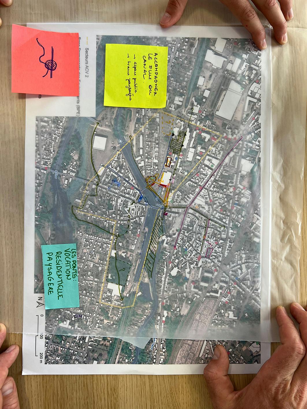 Pour répondre à l’étude sur un calendrier serré, une méthode de deux workshop intensif a été proposé. Nous étions treize architectes, urbanistes et paysagistes à élaborer un projet sur place pendant deux périodes de 7 jours. Différents temps étaient proposés : enquête de terrain, arpentage thématisé, retour critique, travail en petit groupe, point croisé, repas collectif.
